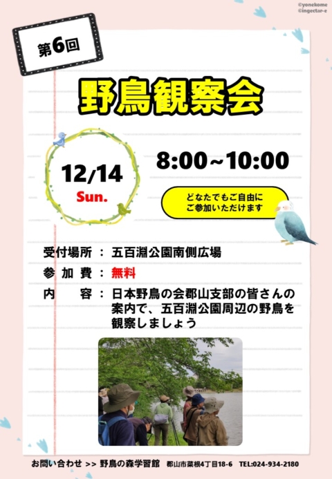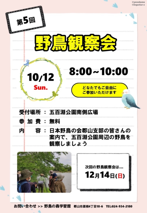 | 内容 | 五百淵公園内の野鳥を観察する |